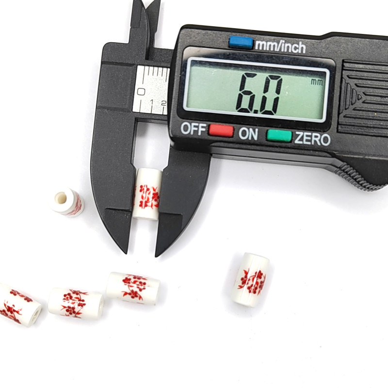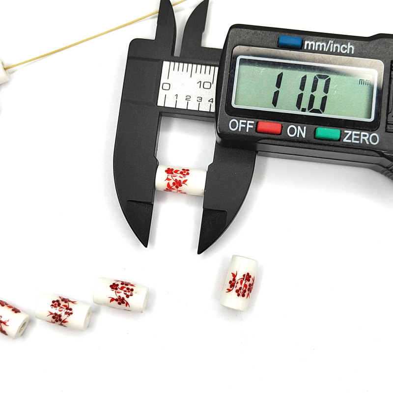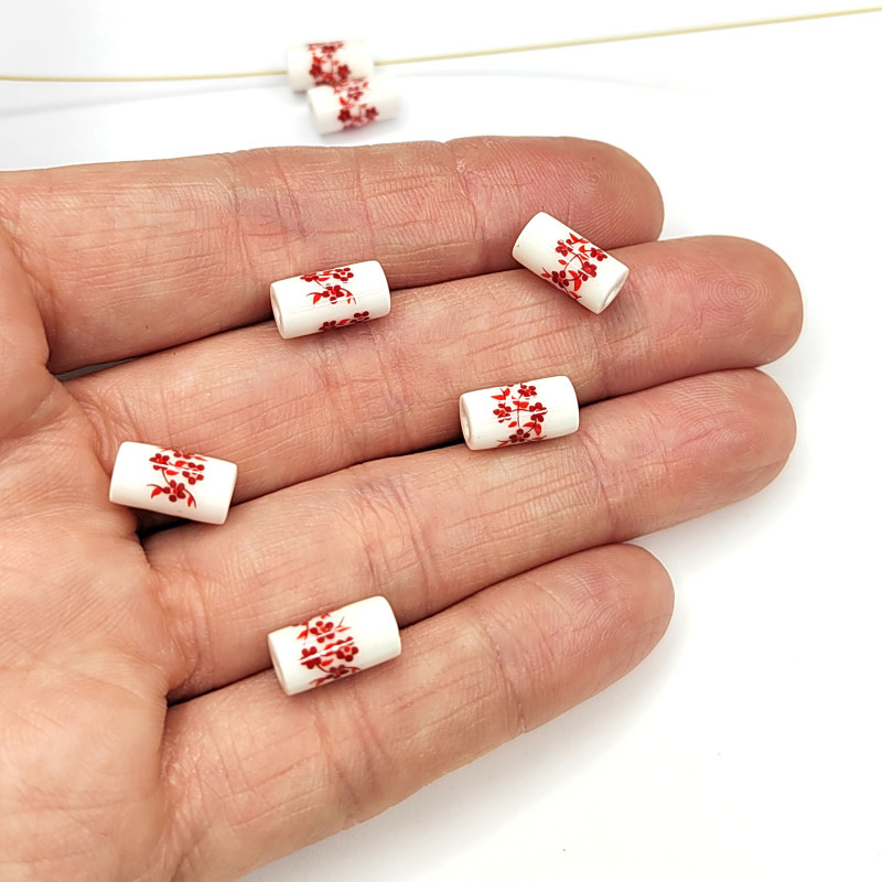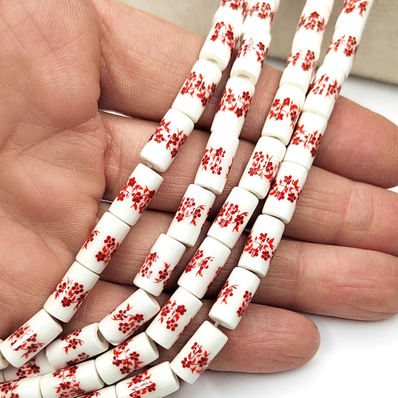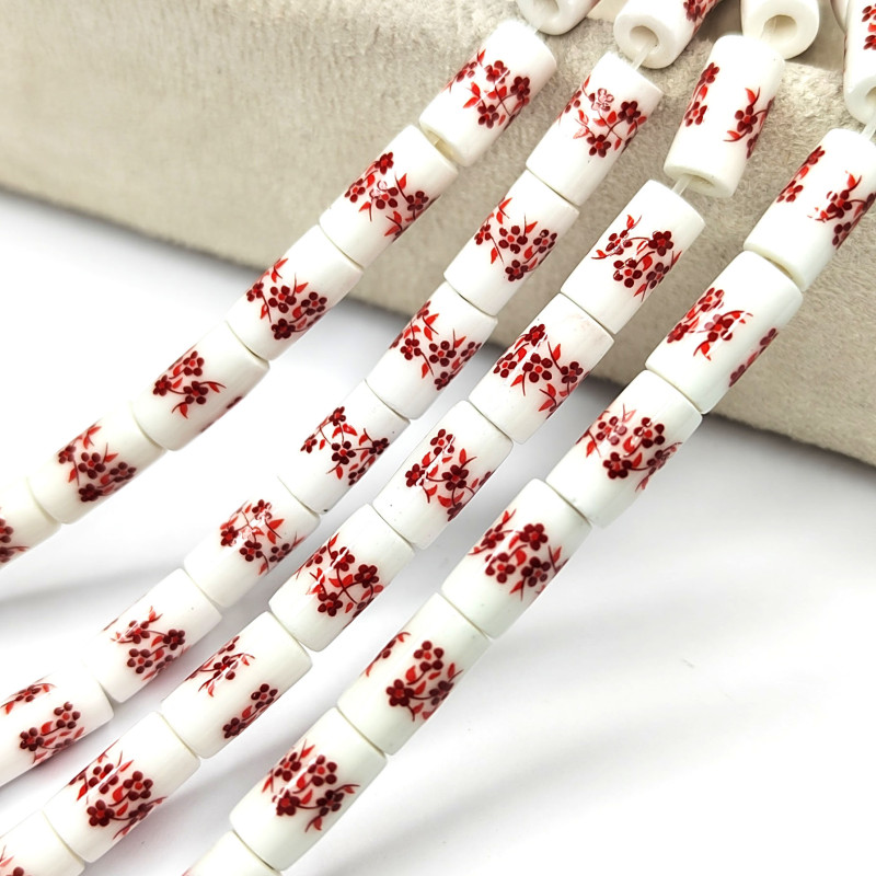 Бусины керамические Столбик 11Х6 мм с красным узором Гжель