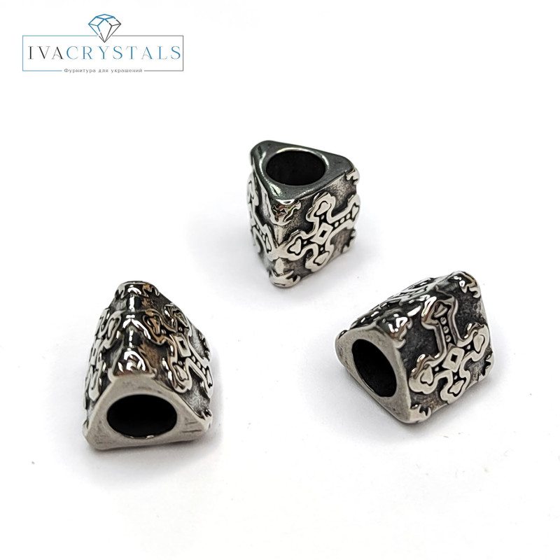 Бусина разделительная из нержавеющей стали с чернением в форме треугольной призмы.