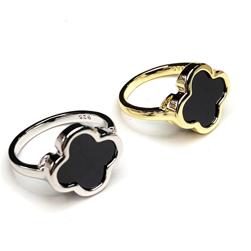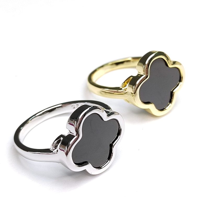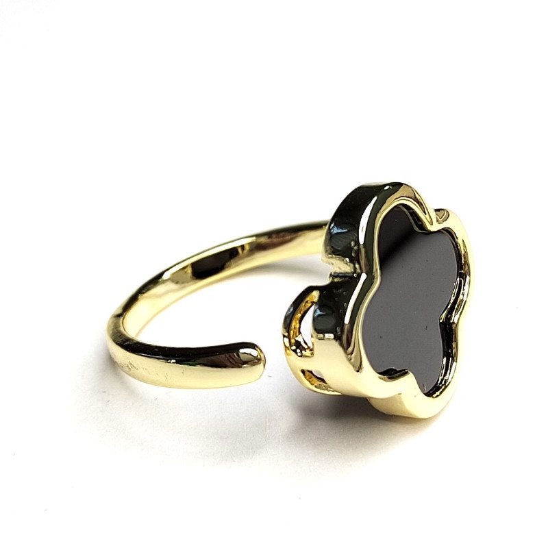 Кольцо в форме Клевера безразмерное с черной керамикой и позолоченным / родиевым покрытием по латуни