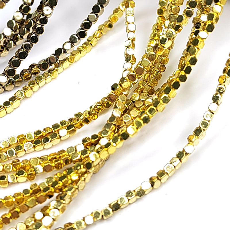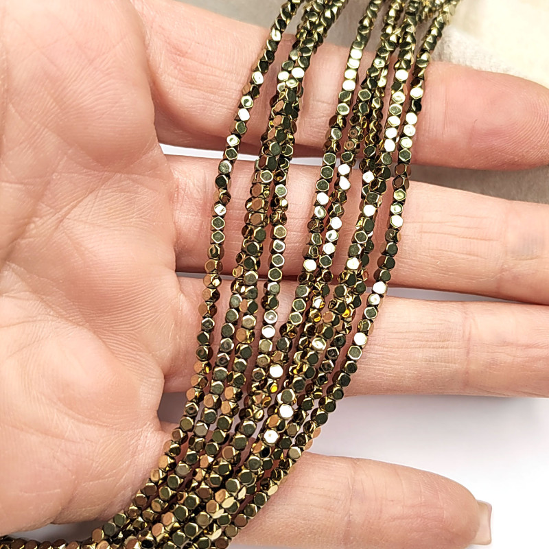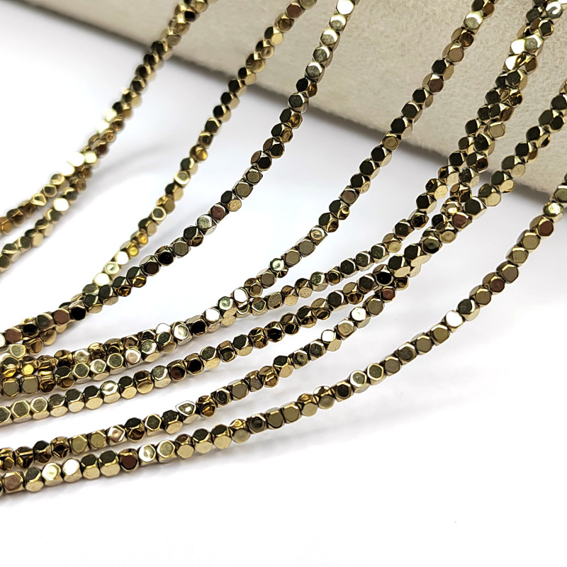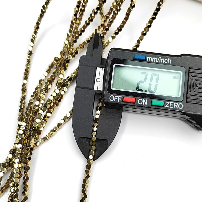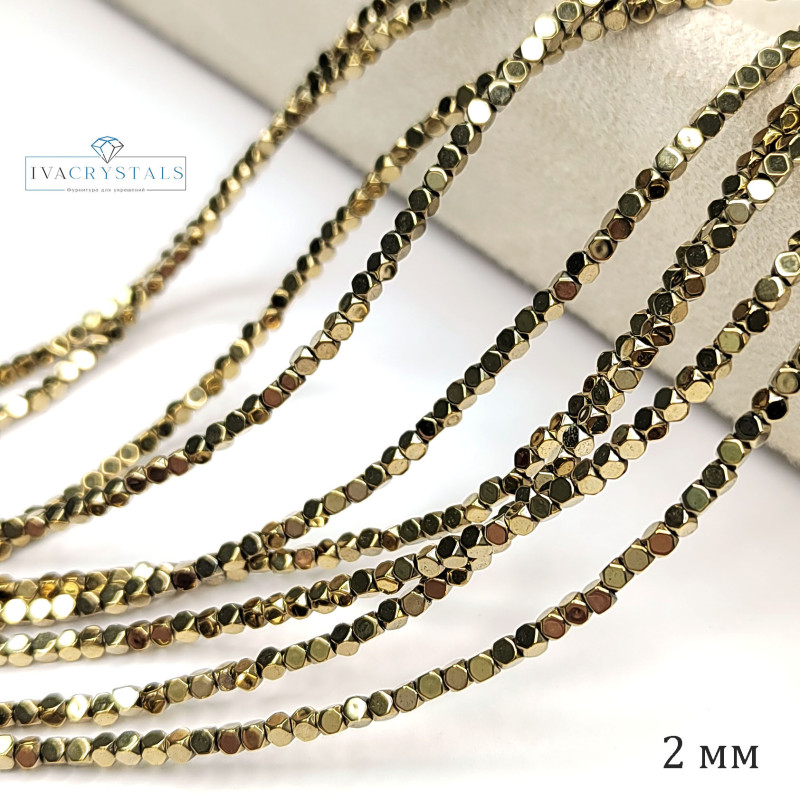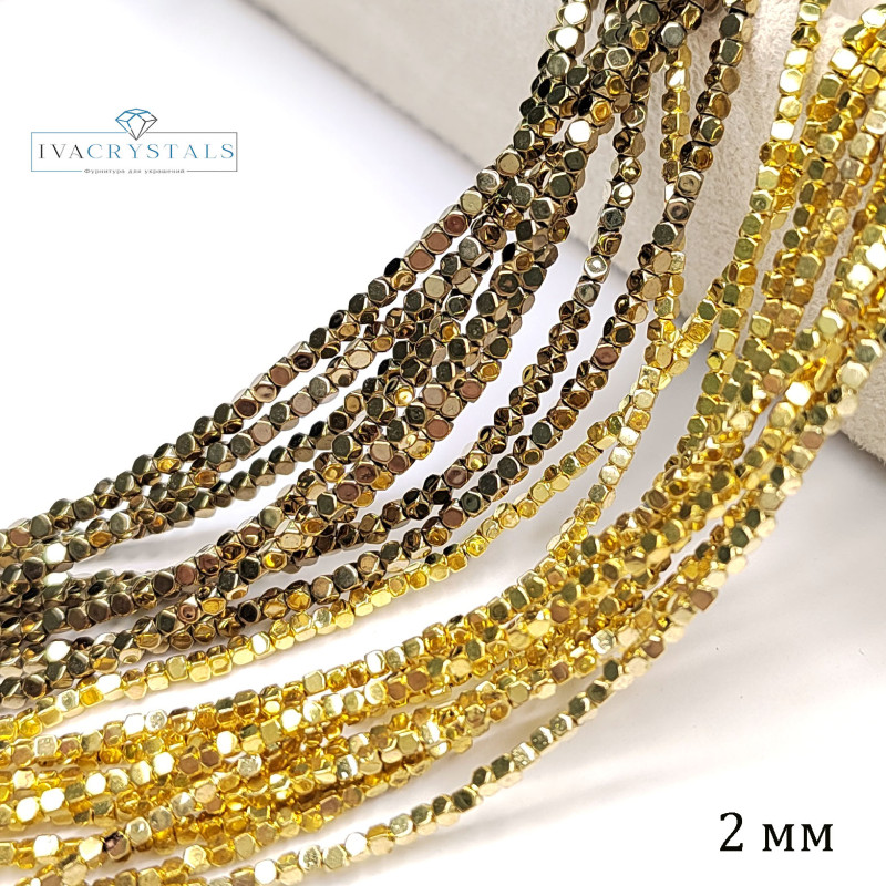 2 мм Гематит кубик с гранями, покрытие позолота, нить 40 см